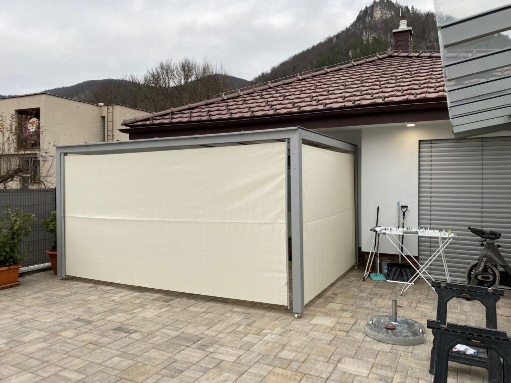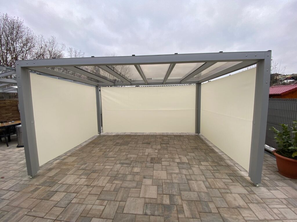 - bočné steny – sklenené posuvné systémy, screen rolety, lamelové panely,
